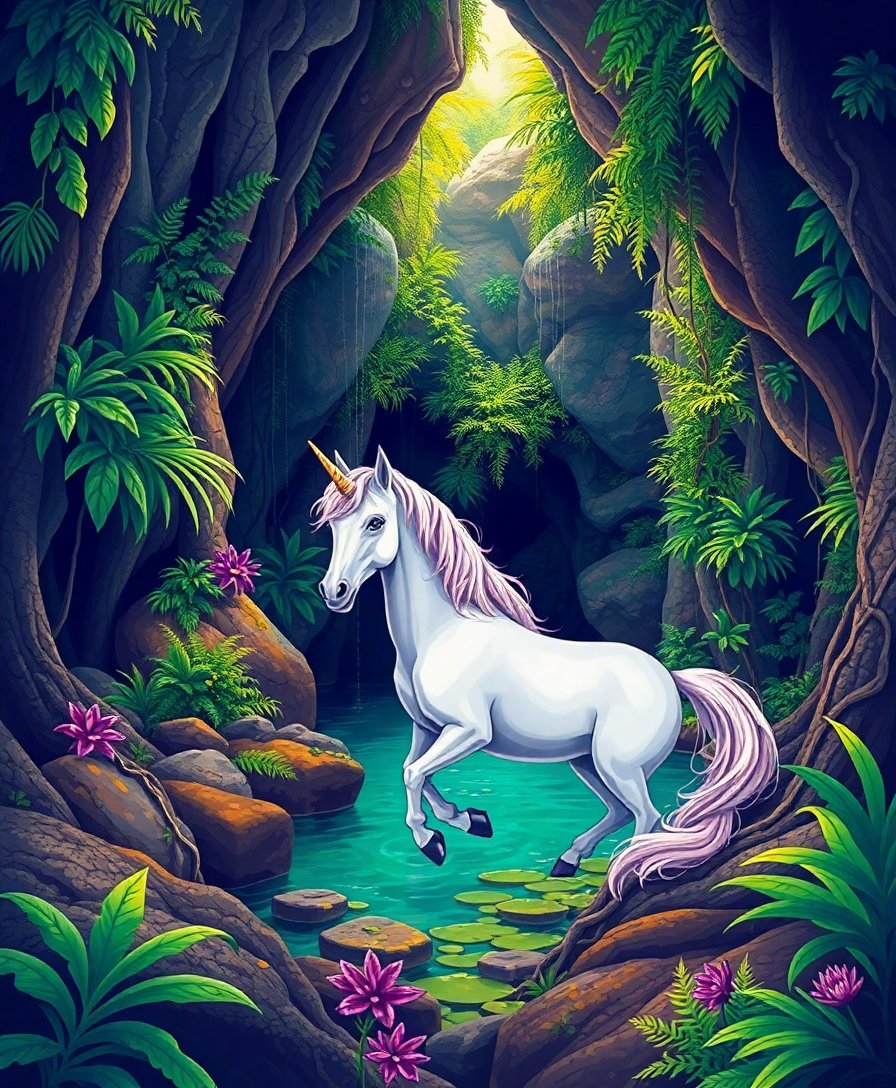 Transform your space with this breathtaking Realistic Jungle Cenote Unicorn Paint By Numbers masterpiece. This enchanting kit brings the magic of a mythical creature discovering a hidden oasis deep within a lush green jungle paradise.