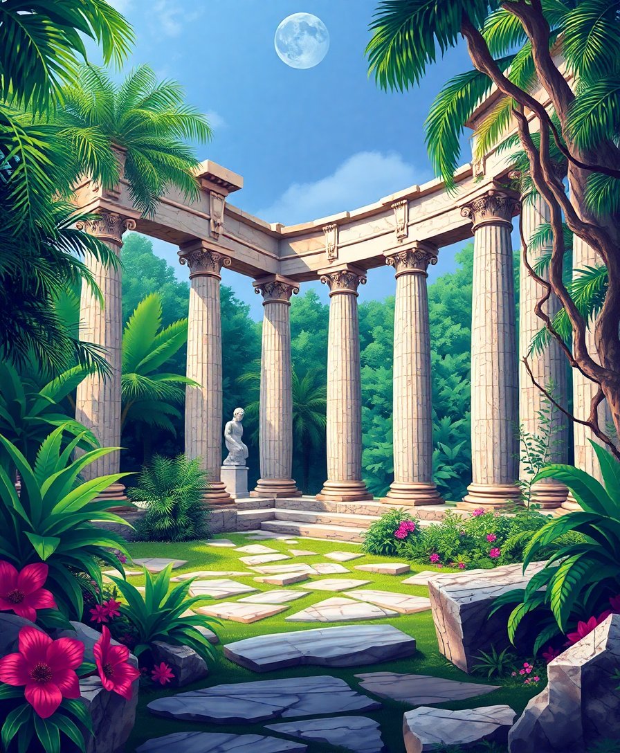 Ultimately, add final touches to vines and weathered marble textures using the smallest brush. Your completed artwork showcases the timeless beauty of classical architecture reclaimed by nature’s persistent growth.