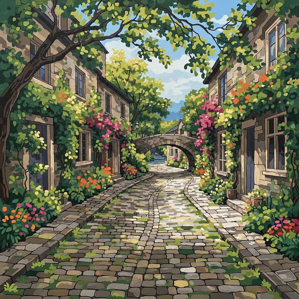 Ultimately, step back and admire your finished architectural masterpiece. Furthermore, the detailed cobblestone texture and lush greenery create stunning visual depth. Finally, your completed artwork transforms any room into a European-inspired sanctuary.