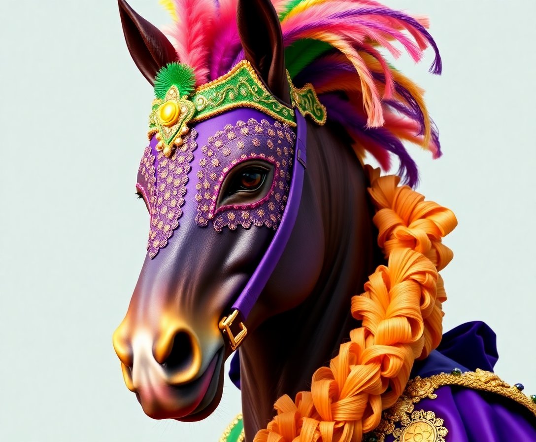 The realistic details capture authentic Mardi Gras costume elements and Spanish moss textures. The festive horseman theme combines traditional carnival imagery with artistic sophistication.