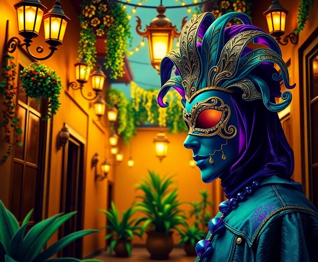 The realistic shadows and illumination effects create stunning depth and atmosphere. The festive mask elements add intrigue while the courtyard setting provides elegant sophistication.