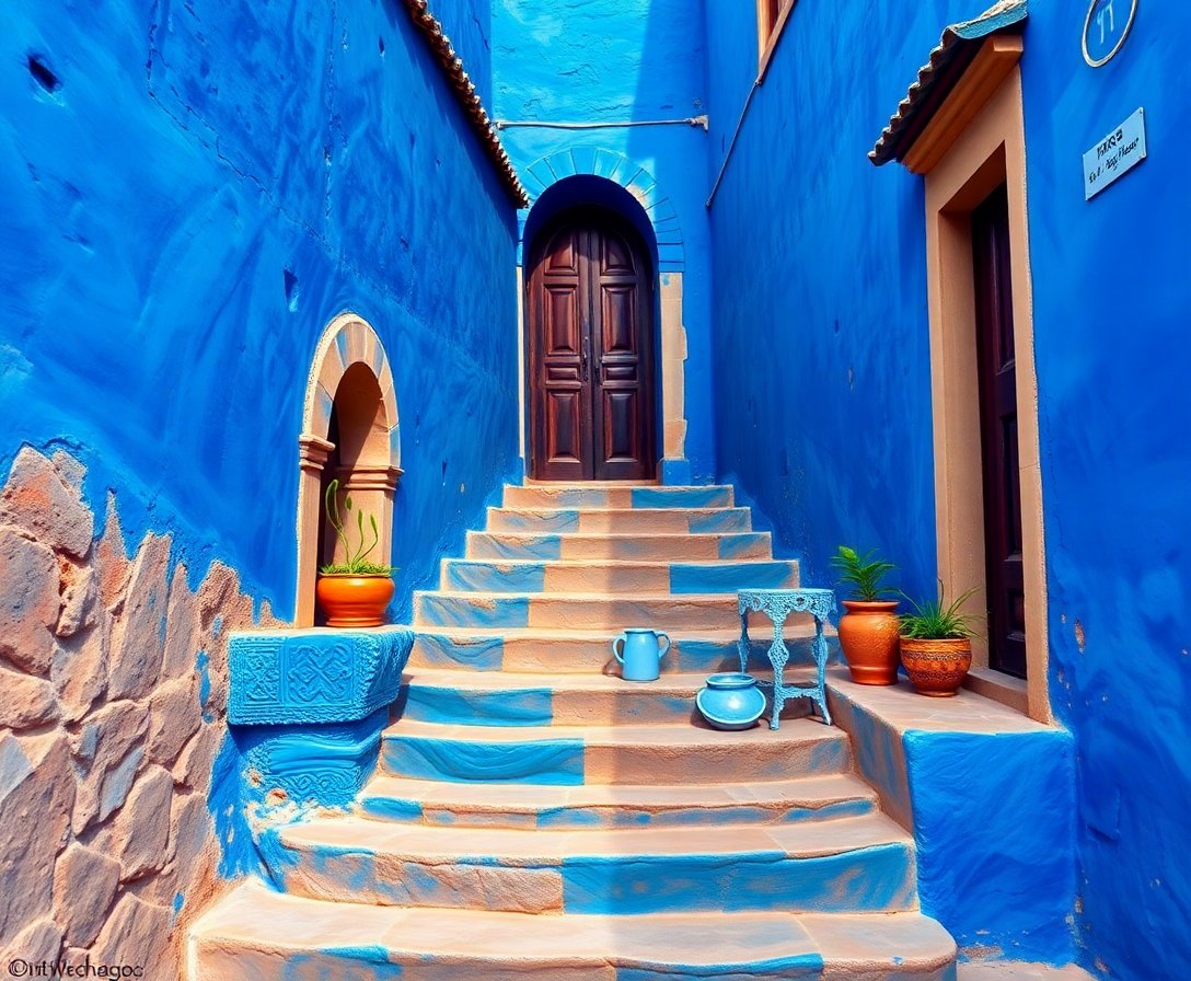 Ultimately, witness your masterpiece emerge as the final details bring the medina steps to life. The rich indigo hues contrast beautifully with warm terracotta tones, creating depth and authenticity in your finished artwork.