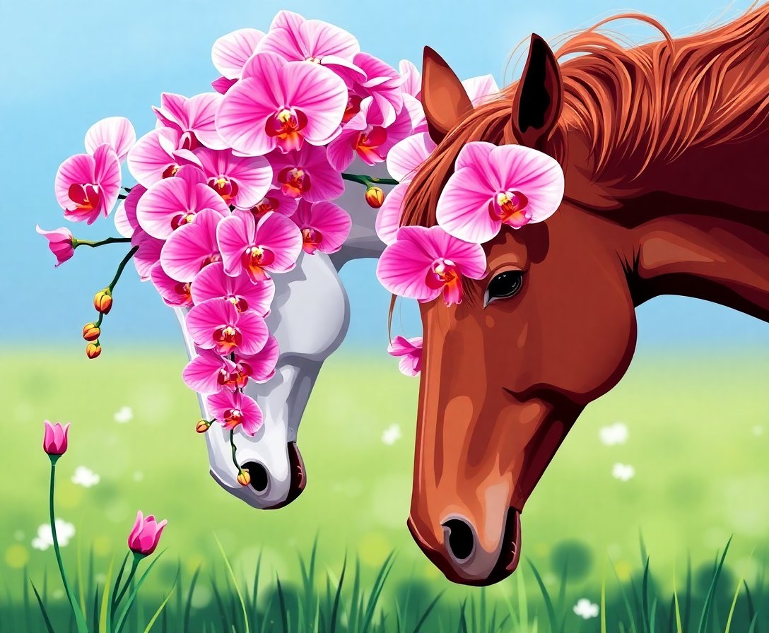 Embark on this magnificent artistic adventure today. Create a treasured masterpiece that celebrates the timeless beauty of horses in their natural habitat surrounded by elegant orchid blooms.