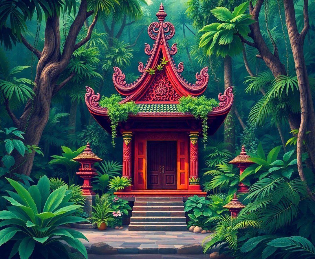 The atmospheric detail captures both realistic foliage textures and ancient shrine architecture beautifully. The emerald color palette creates depth while maintaining authentic Southeast Asian temple aesthetics.