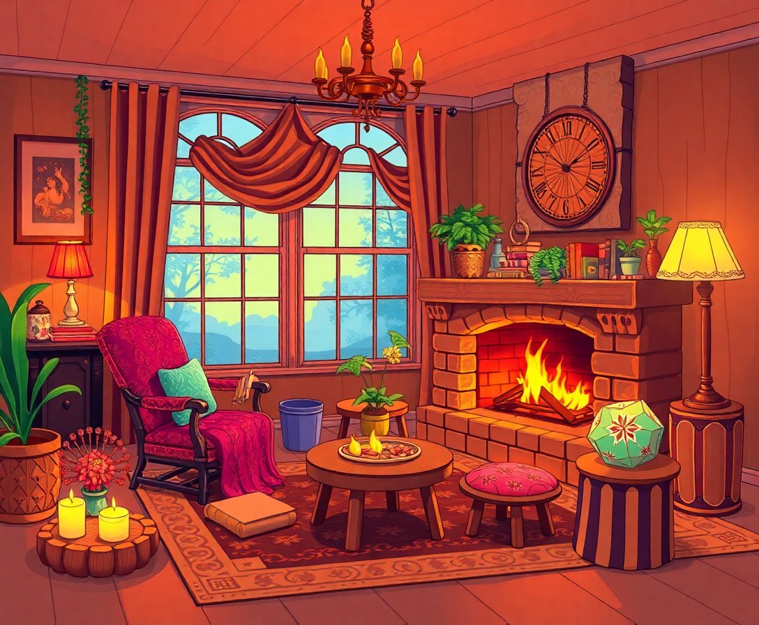 The realistic details capture the cozy atmosphere of a perfect reading nook, complete with firelight ambiance and comfortable furnishings. It’s ideal for book lovers and anyone who appreciates peaceful indoor scenes.