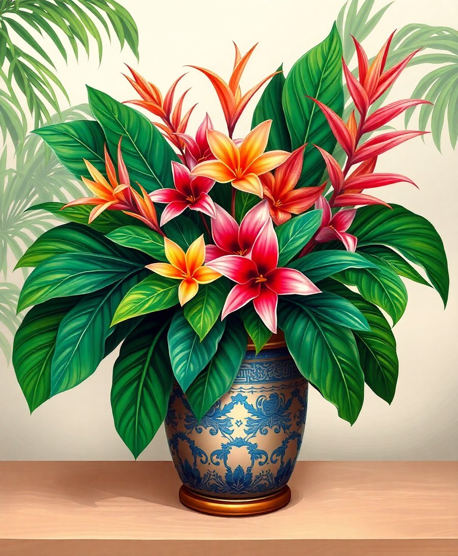 Ultimately, add final touches to smaller details like leaf textures and pot shadows. These finishing strokes transform your painting into gallery-worthy art. Display your completed tropical still life with pride.