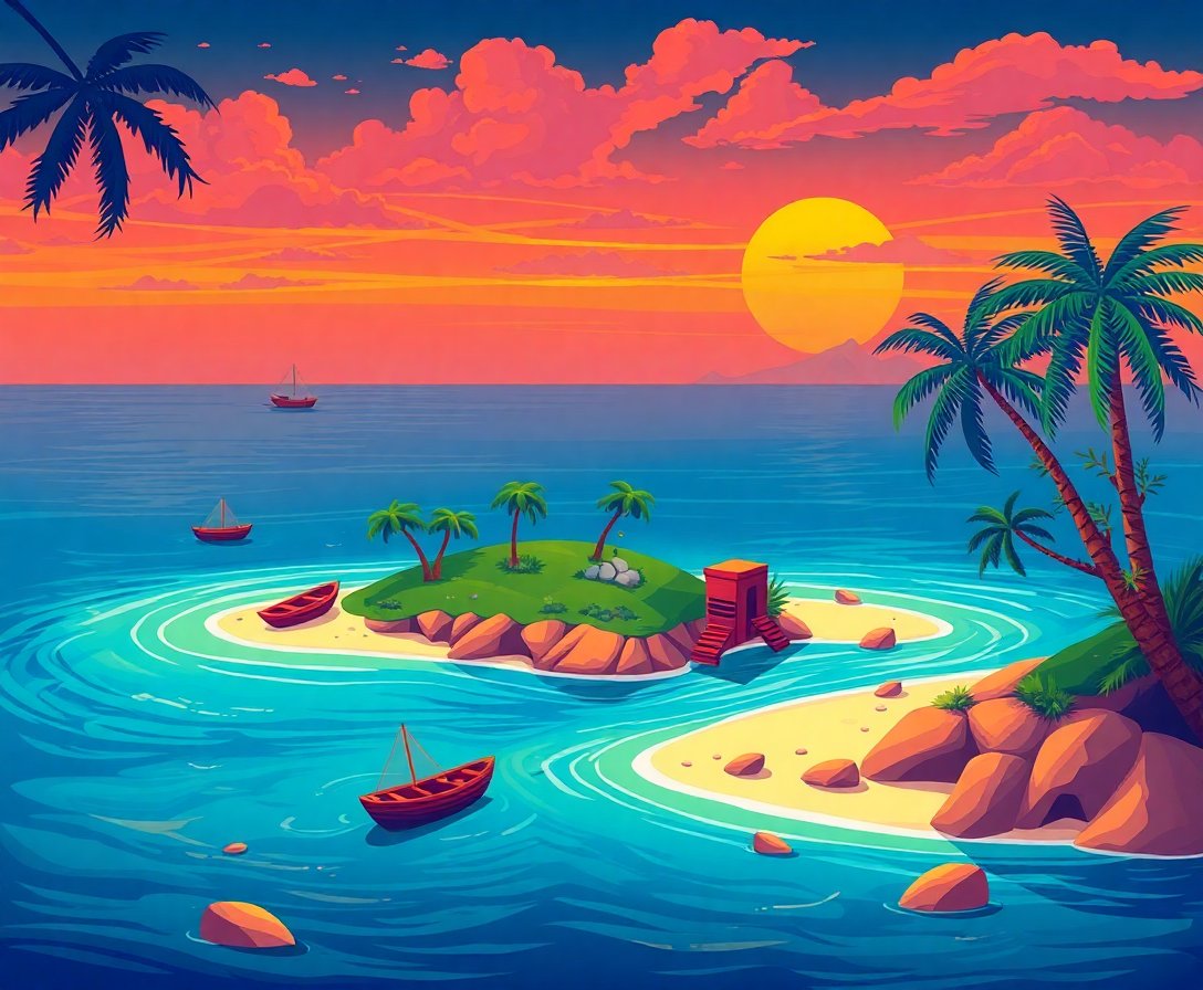 Transform your space with this captivating Realistic Retro Island Gaming Paint By Numbers kit. This unique design blends nostalgic gaming aesthetics with tropical twilight vibes. Create your own masterpiece featuring magenta-hued seaside landscapes reminiscent of classic 8-bit adventures.