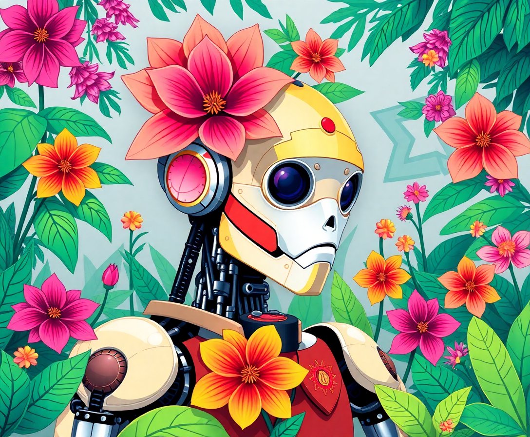 The unique blend of mechanical robots with lush jungle blooms creates a captivating retro-futuristic aesthetic. Luminescent details add magical depth to your finished artwork.