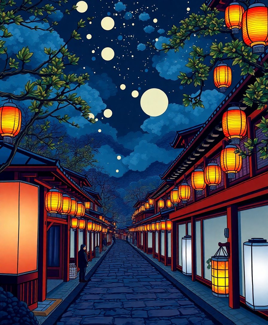 The high-quality linen canvas measures 16×20 inches, providing ample space to capture all the intricate details of the lanterns and nightfall reflections.