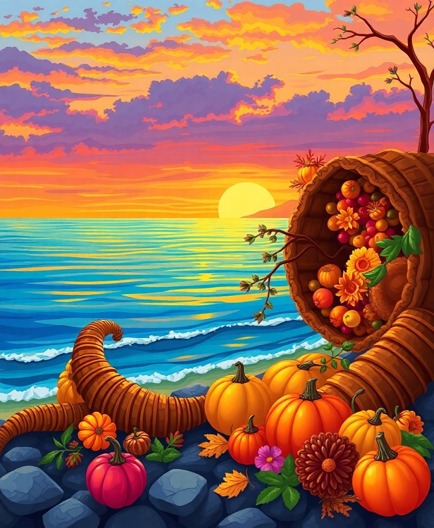 Transform your creative space with this stunning Realistic Seaside Sunset Cornucopia Paint By Numbers kit. This captivating design merges the warmth of a golden ocean sunset with traditional thanksgiving bounty. Experience the joy of creating your own coastal masterpiece while celebrating harvest abundance.