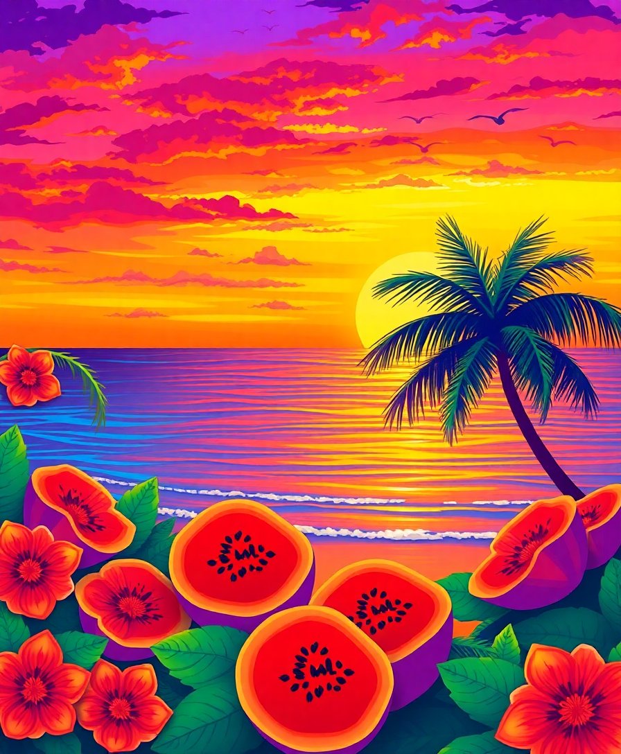 Ultimately, step back and admire your completed tropical sunrise masterpiece. The vibrant papaya trees now glow with realistic summer warmth. Furthermore, your finished artwork becomes a stunning focal point for any room.