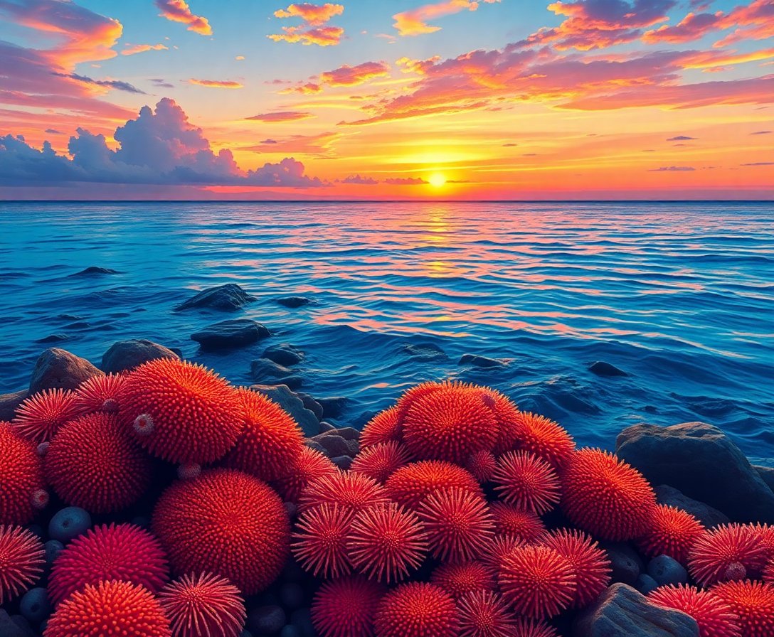 The realistic detail captures stunning macro-level textures of sea urchins illuminated by warm sunset light. This unique perspective showcases tidal pool beauty rarely seen in traditional art.
