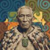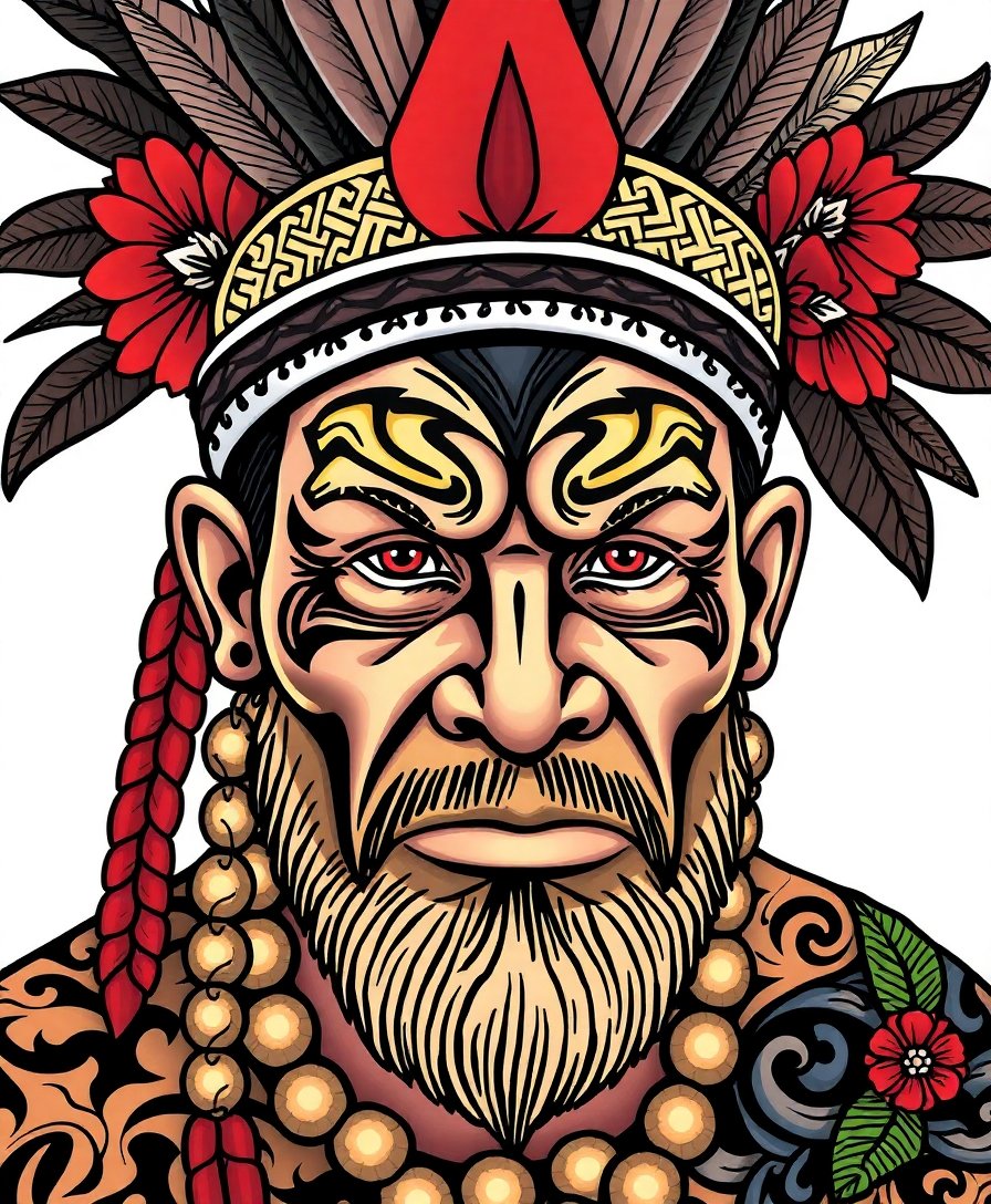 This artwork celebrates traditional Polynesian moko tattoo artistry and tribal leadership heritage. The realistic portrayal honors the cultural importance of these sacred markings in island societies.