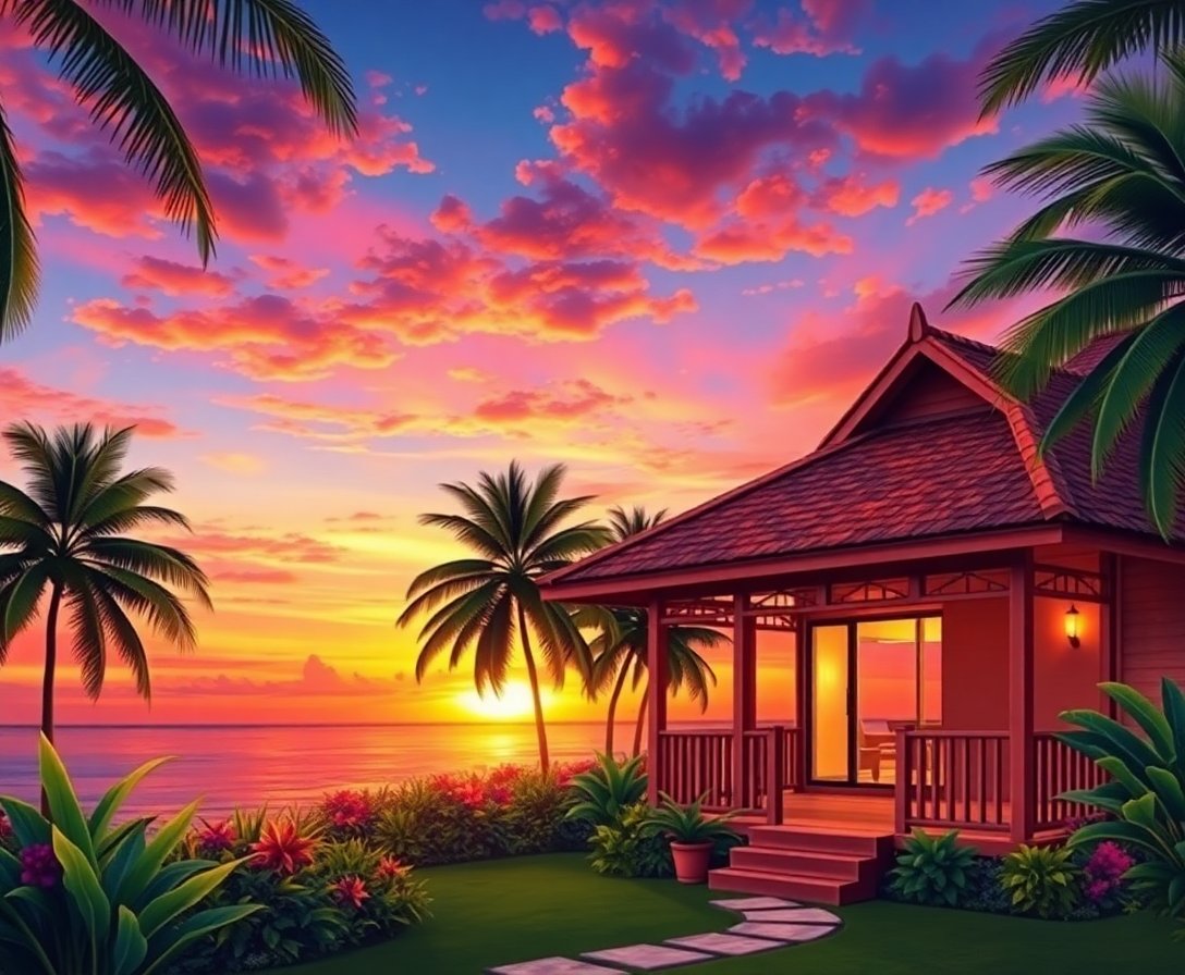 Experience the joy of creating your own tropical escape. This Realistic Tropical Bungalow Dusk Paint By Numbers transforms any room into a peaceful retreat.