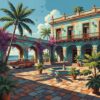 The realistic shadow details and tropical architectural elements create a unique urban landscape. The interplay of palm fronds and building shadows offers both artistic challenge and visual appeal.