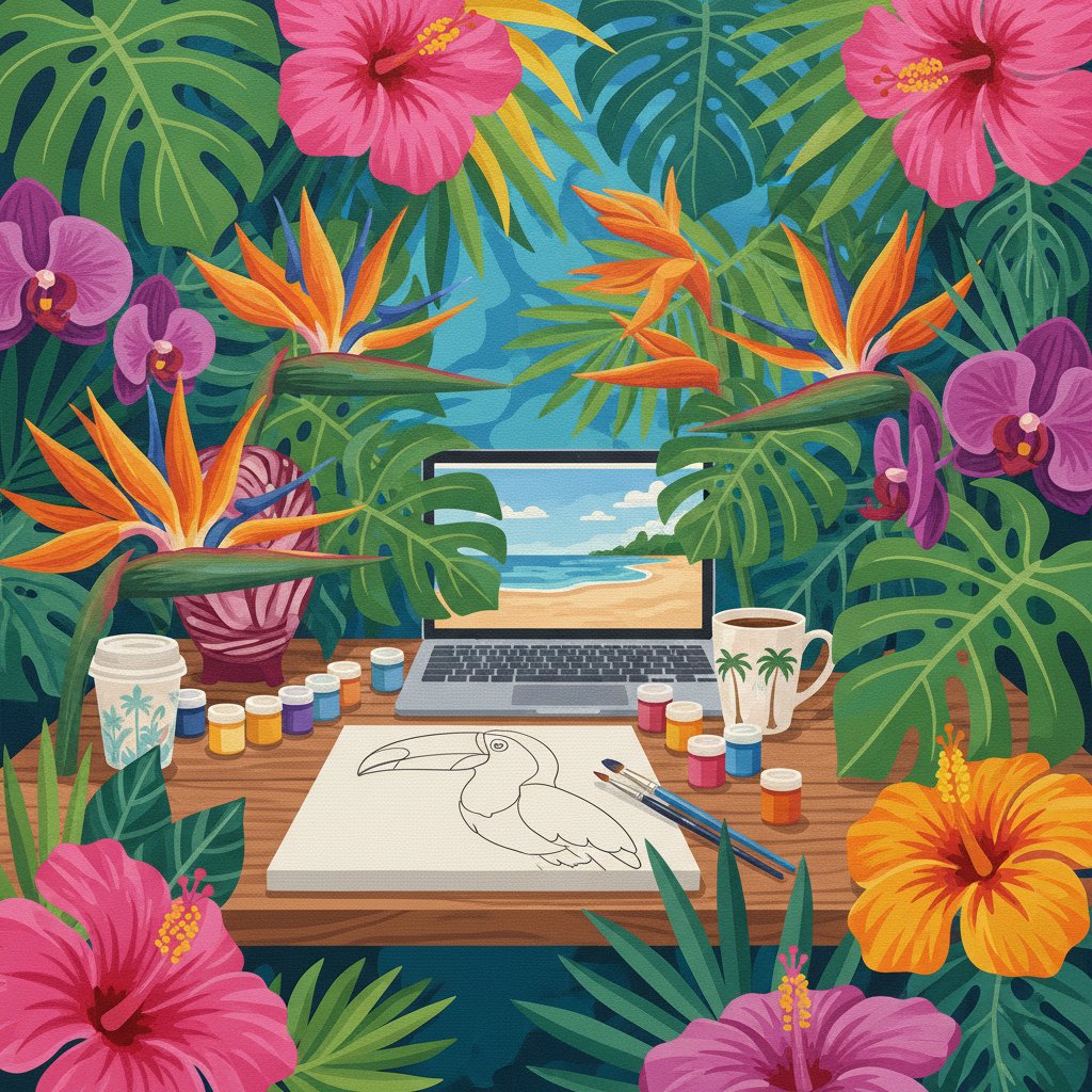 Transform your creative space with this stunning Realistic Tropical Floral Workspace Paint By Numbers design. This beautiful kit captures the vibrant essence of tropical blooms in a vintage-inspired workspace setting. Additionally, the intricate hibiscus details bring warmth and botanical elegance to any room.