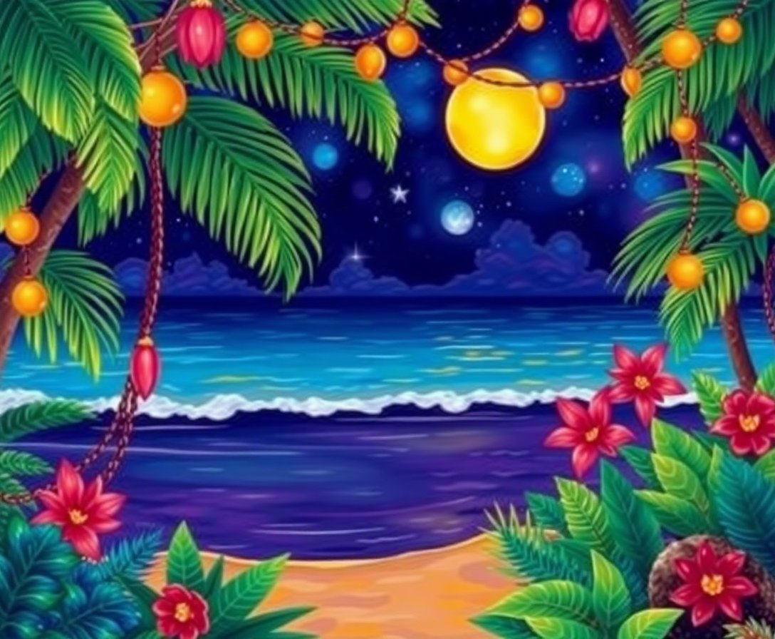 Ultimately, add the final celestial details and string lights. These finishing touches bring your tropical night scene to life. Moreover, allow complete drying before displaying your masterpiece proudly.