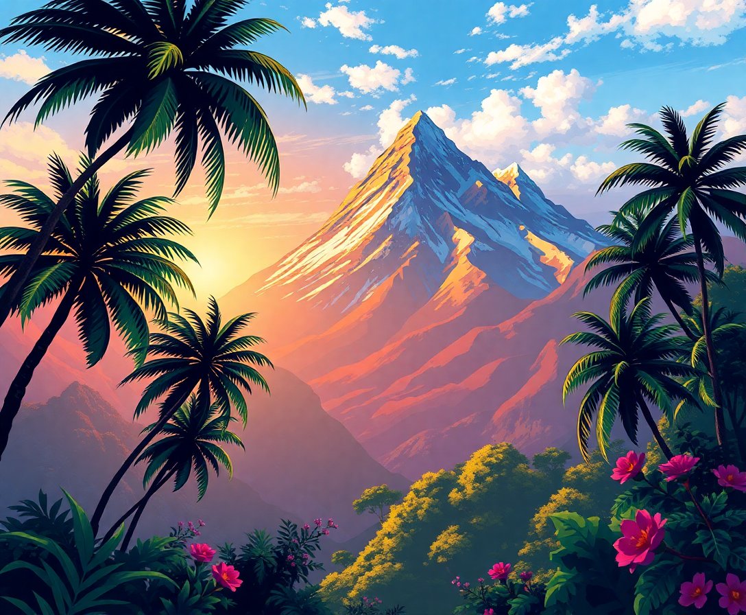 Ultimately, step back and admire your completed tropical paradise. Your finished piece showcases stunning mountain vistas and warm golden tones. Consequently, you’ll feel immense pride in this landscape masterpiece.