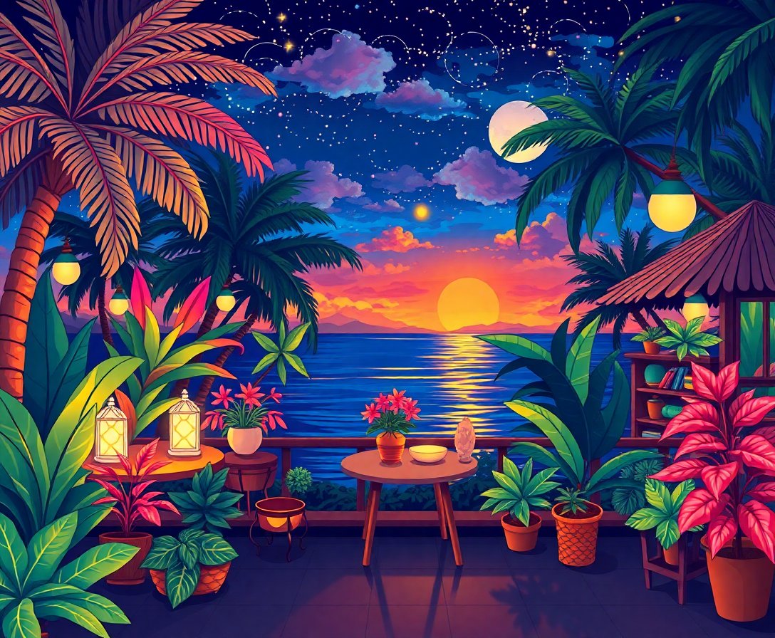 This therapeutic painting experience reduces stress while enhancing focus and creativity. Meanwhile, the tropical nightscape theme creates a calming atmosphere perfect for unwinding. The entertainment art style combines relaxation with artistic expression beautifully.
