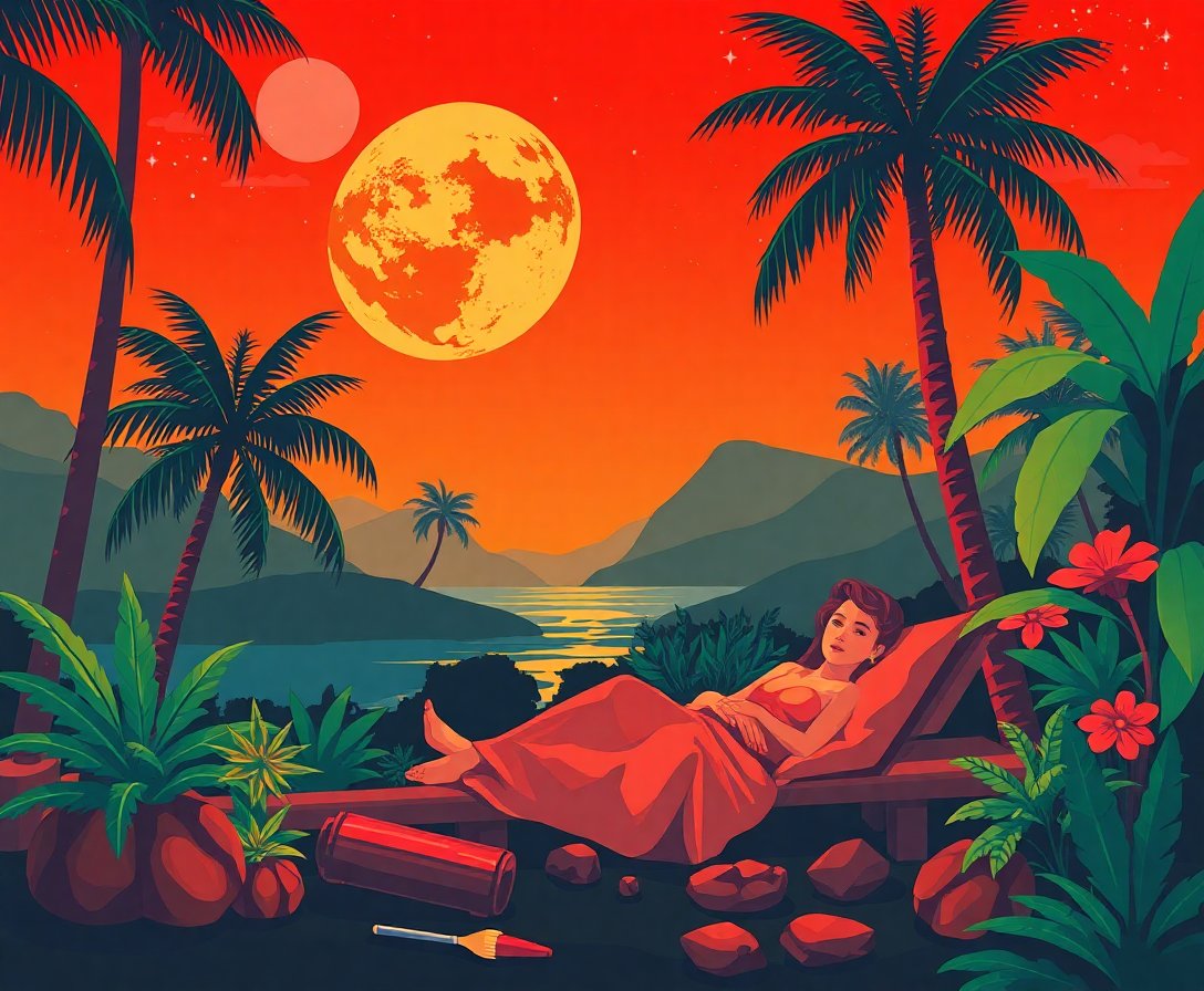 This unique design captures the nostalgic appeal of vintage space exploration with tropical relaxation elements. The crimson landscape creates a striking visual that perfectly embodies retro-futuristic artistry.