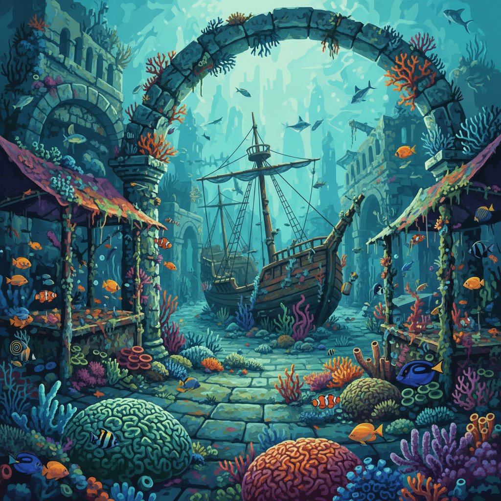 Transform your artistic journey with this captivating Reef Covered Merchant Plaza Paint By Numbers masterpiece. This enchanting design brings together the mystical allure of submerged ancient architecture with vibrant marine life. Moreover, each brushstroke reveals intricate details of coral-covered ruins and oceanic beauty.
