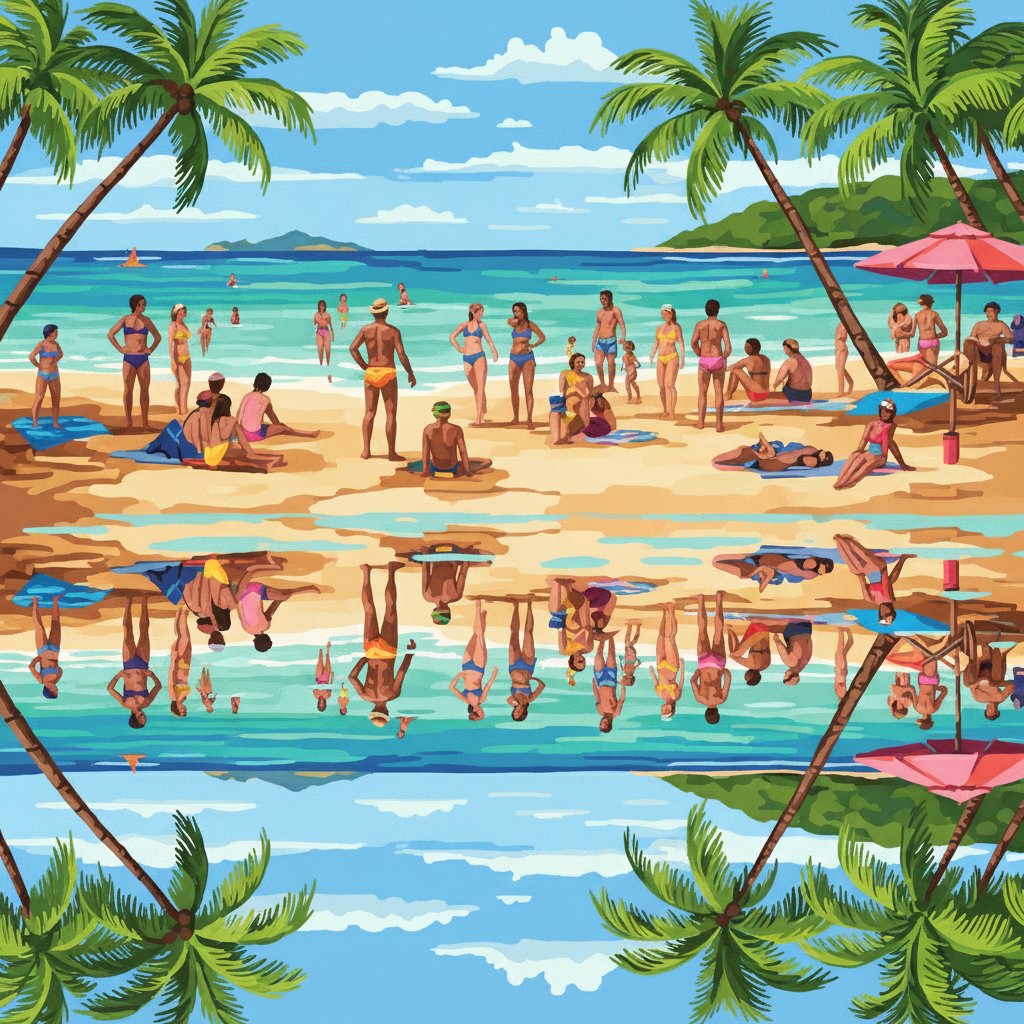 Transform your creative space with this vibrant Reflected Tropical Beach Crowd Paint By Numbers masterpiece. This stunning design captures the essence of a lively beach scene filled with music lovers wearing stylish sunglasses. Each numbered section guides you through creating this realistic tropical paradise. The detailed artwork brings together the energy of vintage concert posters with modern artistic expression.