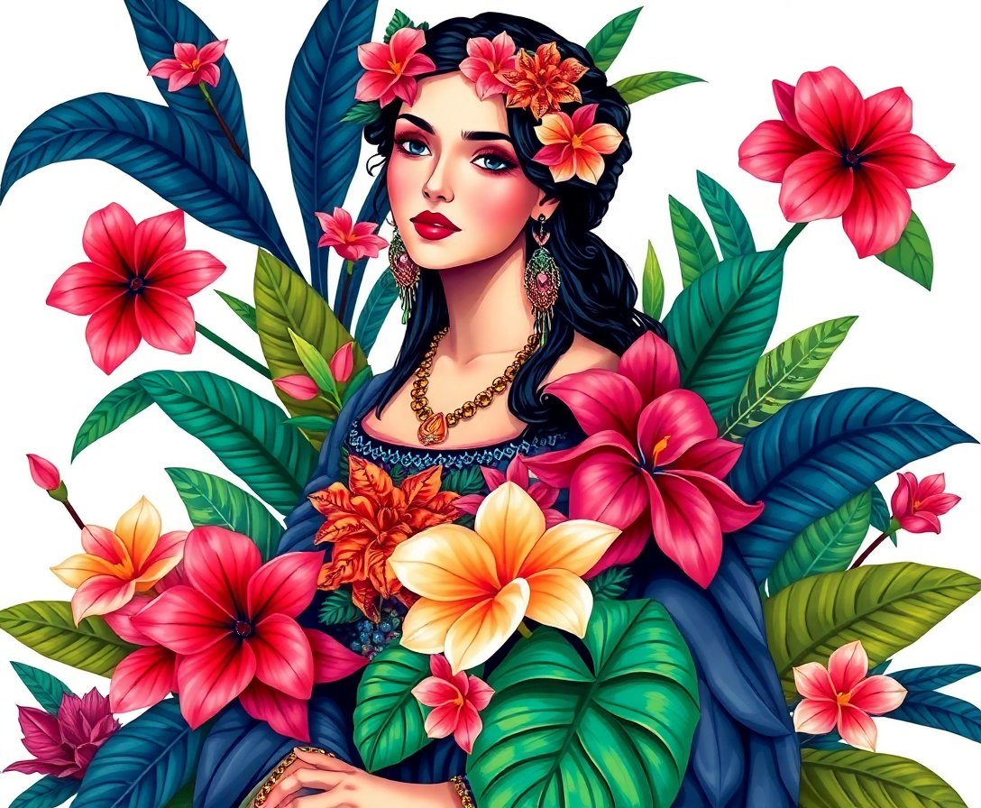 This unique design combines Renaissance elegance with tropical botanical elements, creating a sophisticated fusion of historical art and natural beauty that stands out from typical portraits.