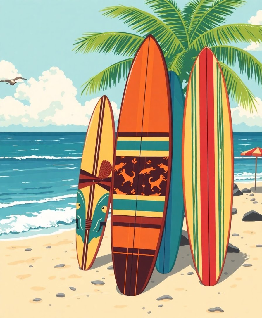 Ultimately, step back and admire your completed tropical masterpiece. Add final touches to enhance the vibrant waves and ocean details. Your finished artwork captures the authentic spirit of retro surf culture ready for display.