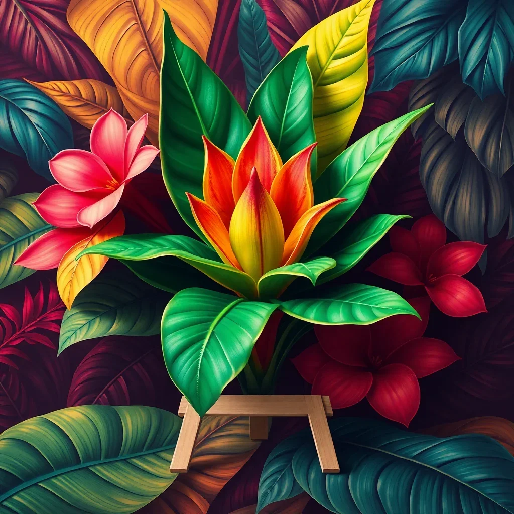 This unique artwork combines nostalgic audio culture with vibrant island florals. The result is a striking piece that appeals to music lovers and nature enthusiasts alike.