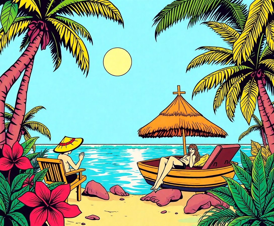 This design captures authentic golden era comic styling with tropical detective themes. The sunset colors and shadow details create a sophisticated nostalgic atmosphere perfect for any space.