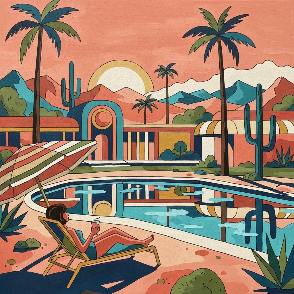 Transform your space with this nostalgic desert pool scene that evokes vintage aesthetics and endless summer memories. Start your creative journey today and discover the joy of bringing this tropical oasis to life.