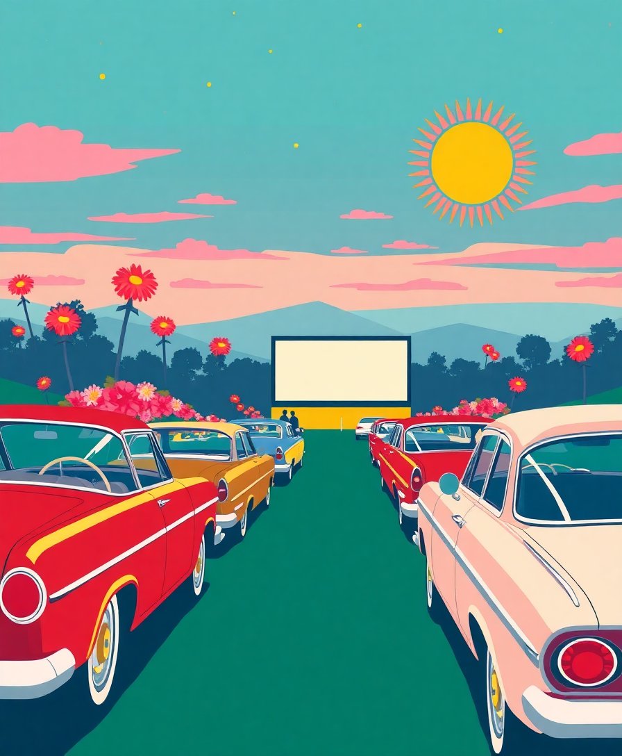 The sepia-toned botanical silhouettes capture authentic drive-in theater nostalgia with artistic poster aesthetics. This unique combination creates stunning entertainment art perfect for vintage decor enthusiasts.