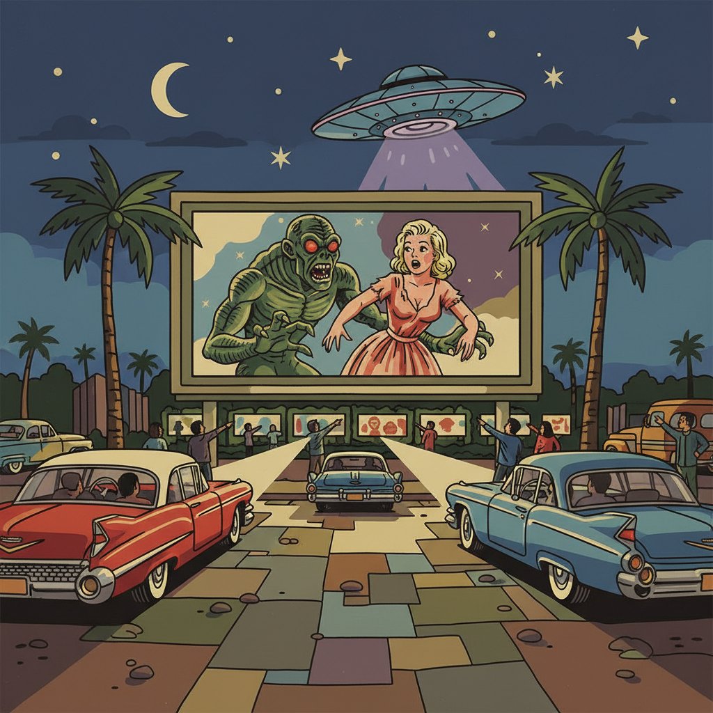 This design captures authentic drive-in movie poster aesthetics with rich neon colors and dark suspenseful elements. The nostalgic theme creates a unique piece perfect for entertainment rooms or vintage collections.
