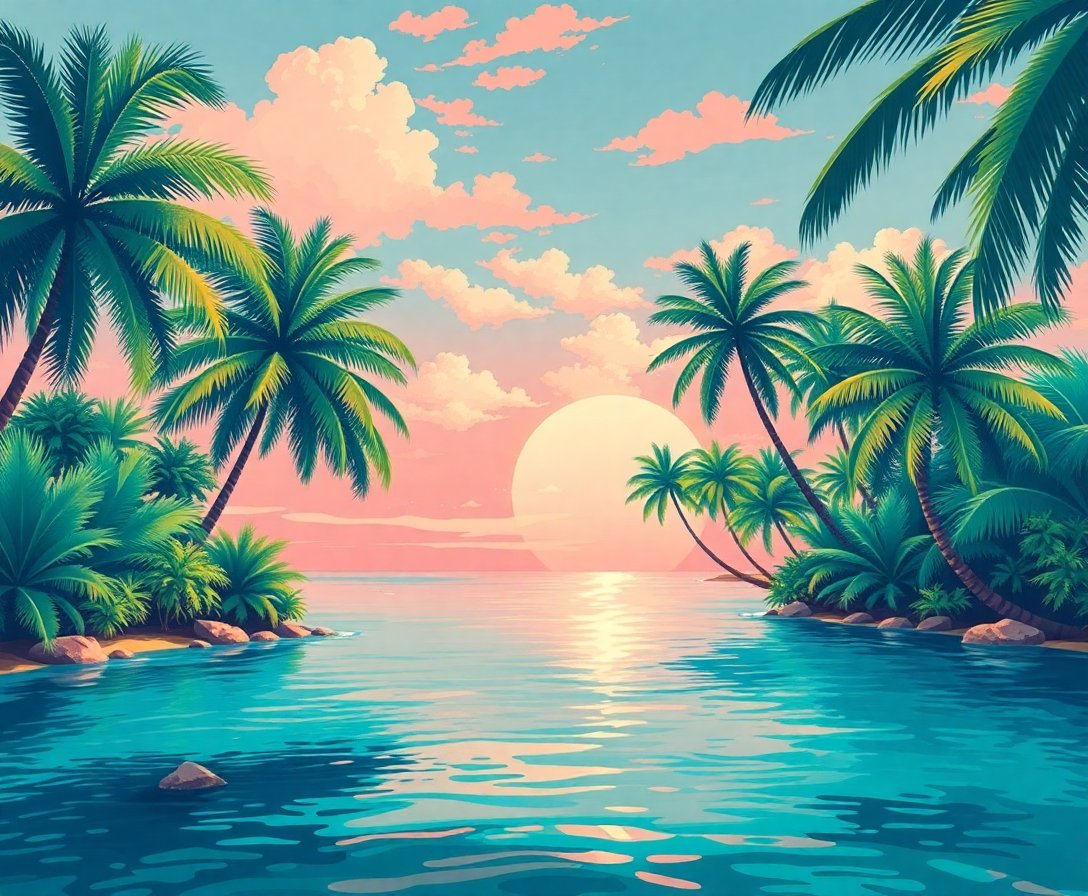Ultimately, add final details to complete your vintage lagoon masterpiece. Thus, your beach coastal creation becomes ready for display. Meanwhile, the emerald waters and swaying palms create a stunning focal point for any room.