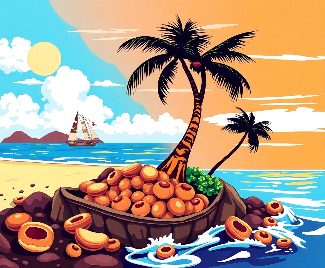 The sepia tones and Hawaiian typography capture authentic retro advertising charm. This macadamia nut theme brings tropical nostalgia to modern spaces.
