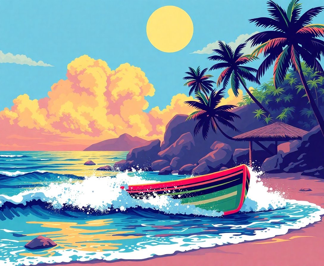 Transform your space with the captivating nostalgia of the Retro Island Surf Flick Paint By Numbers. This vintage-inspired masterpiece captures the essence of classic Hawaiian surf films. Moreover, it brings the golden age of drive-in cinema directly to your walls.