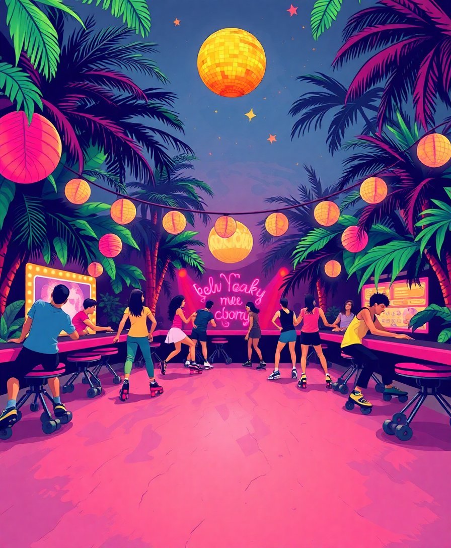 Ultimately, step back and admire your finished tropical roller disco scene. Furthermore, the vibrant jungle elements contrast beautifully with retro skating imagery. Thus, your completed masterpiece captures both vintage charm and artistic achievement.