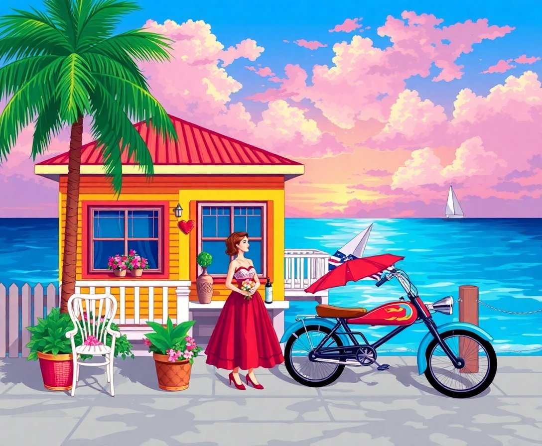 Transform your creative space with this enchanting Retro Key West Love Paint By Numbers kit. This vintage-inspired masterpiece captures the timeless romance of Florida’s most beloved island destination. Meanwhile, every brushstroke brings nostalgic charm to life through coral sunsets and classic moped adventures.