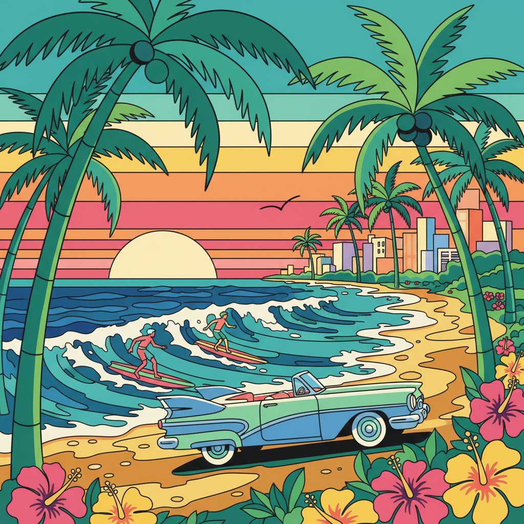 Embrace the laid-back coastal vibe and create your own tropical skateboarding paradise. This vintage aesthetic will transport you to endless summer days with every brushstroke.