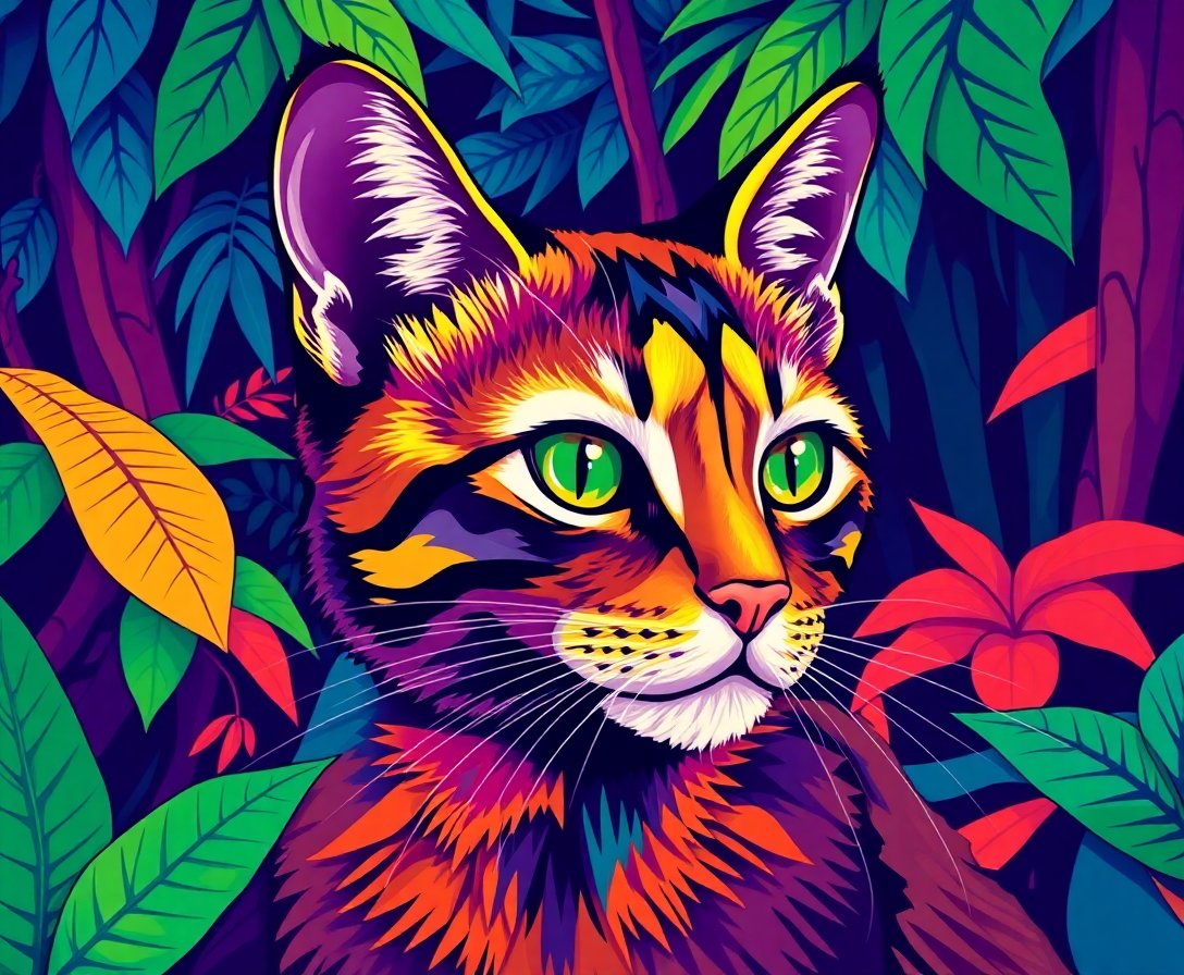 The prismatic rainforest cat combines vintage retro cubism with vibrant feline artistry. This unique fusion creates a striking piece that celebrates both artistic movement and natural beauty.
