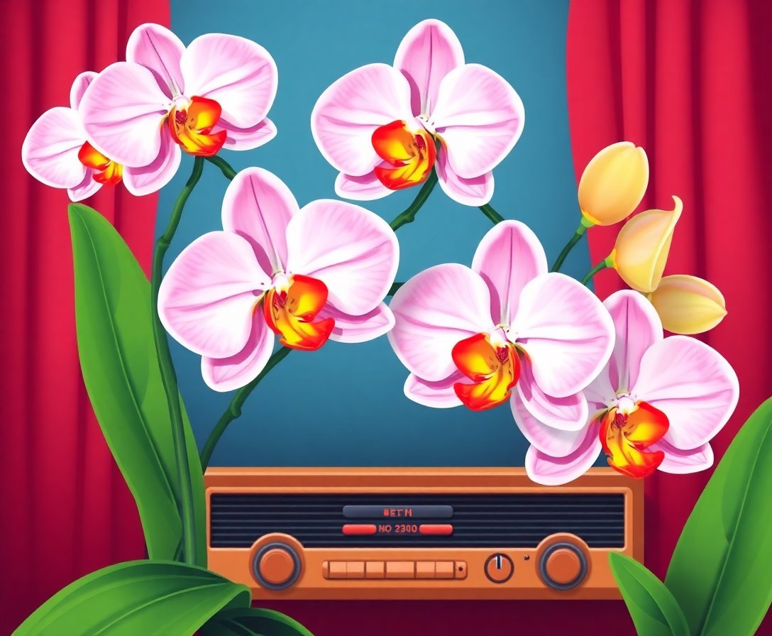Ultimately, step back and admire your finished broadcasting-themed creation. The vibrant orchids and vintage radio elements create a stunning display piece. Your completed artwork celebrates the golden era of radio performance with artistic elegance.