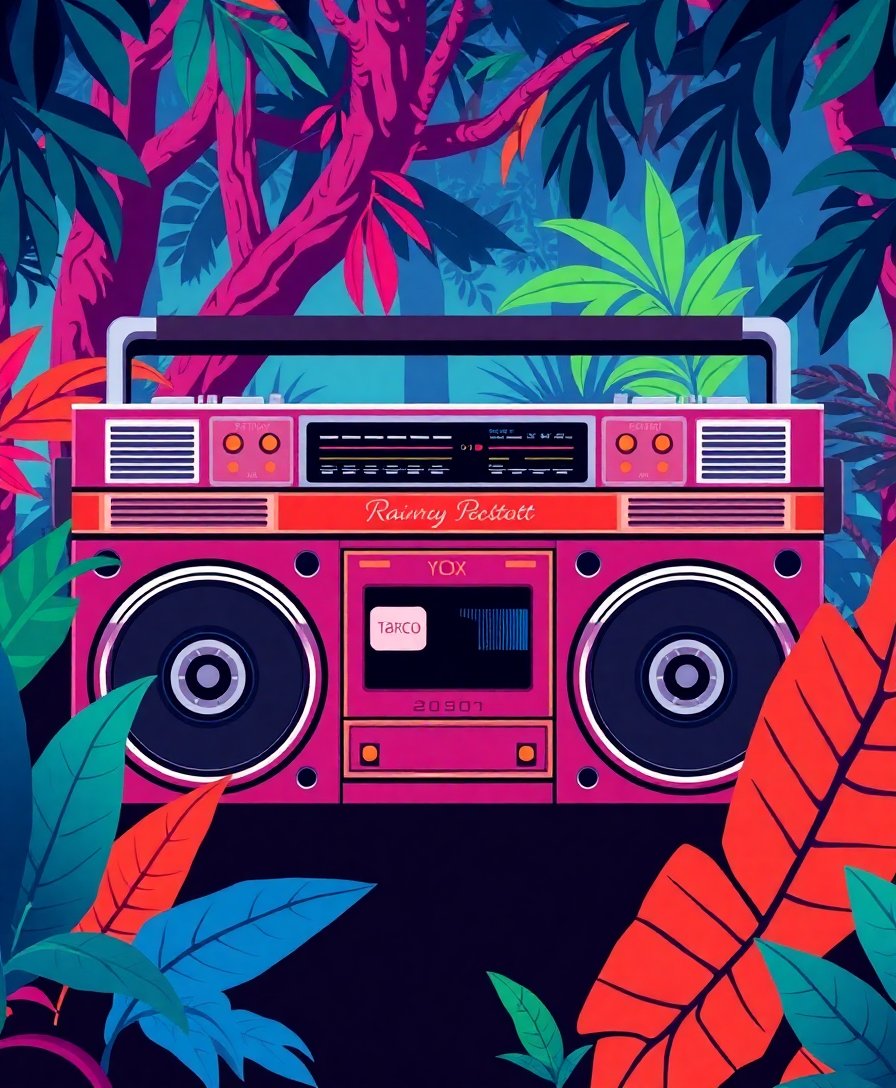 Ultimately, step back and admire your finished vintage-inspired creation. The realistic rainforest elements combined with retro stereo details create a striking visual impact. Your completed artwork celebrates both nature and music culture in perfect harmony.