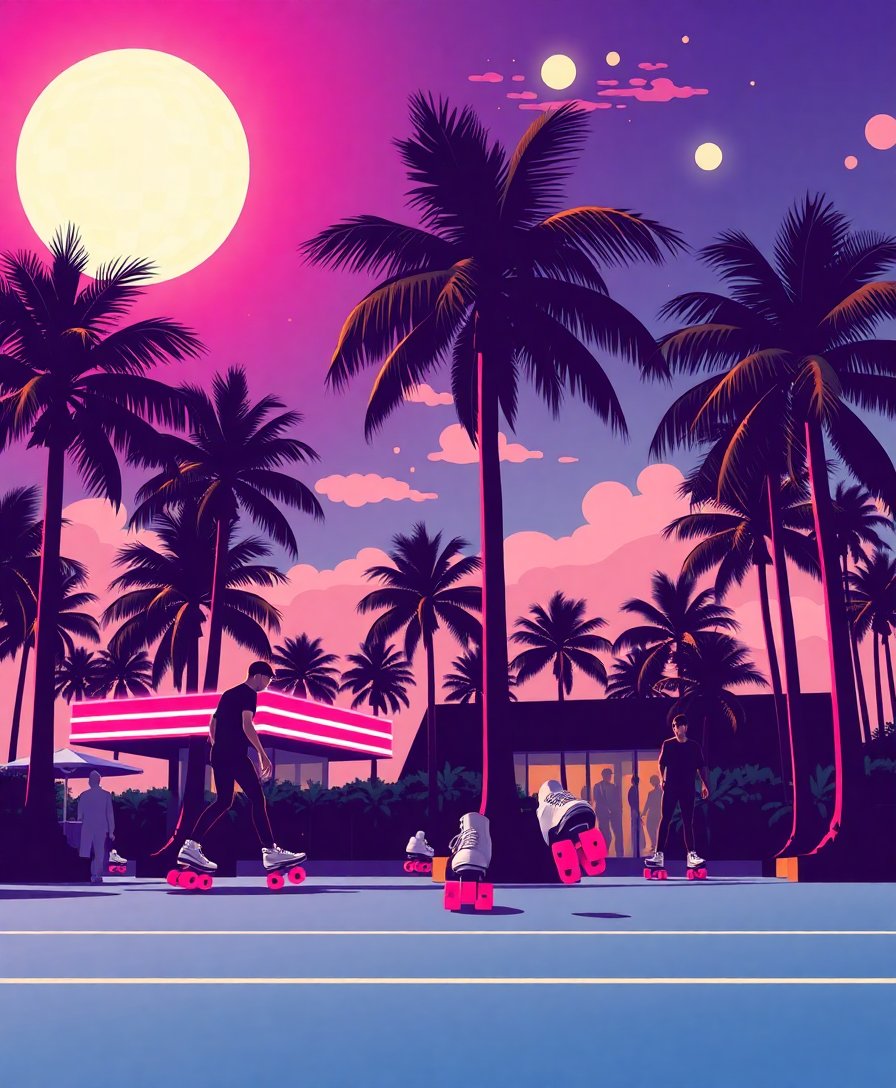 Ultimately, step back and admire your completed masterpiece with pride. Moreover, the vibrant palm trees and classic skates create stunning visual impact. Additionally, your artwork perfectly captures that iconic roller disco atmosphere.