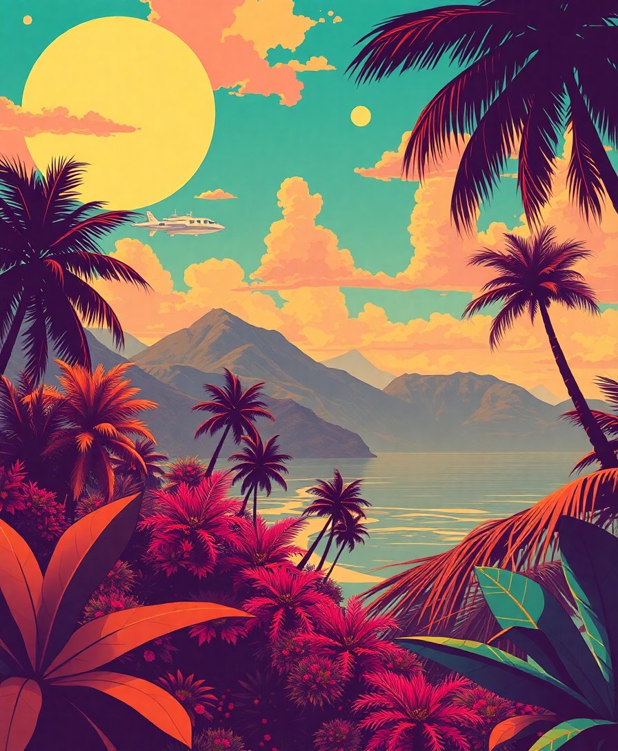Transform your space with this captivating Retro Tropical Atmosphere View Paint By Numbers kit. This stunning midcentury-inspired design brings together lush tropical elements with cosmic atmosphere effects. Create your own entertainment art masterpiece that captures the essence of mid-century sci-fi aesthetics.