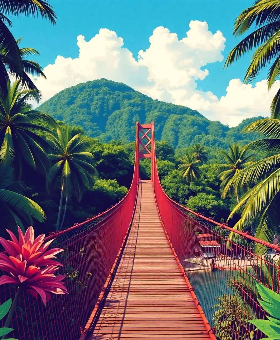Ultimately, step back and admire your completed vintage tropical scene. Furthermore, the suspension bridge emerges majestically among monstera leaves. Additionally, your finished artwork captures timeless tropical architecture.