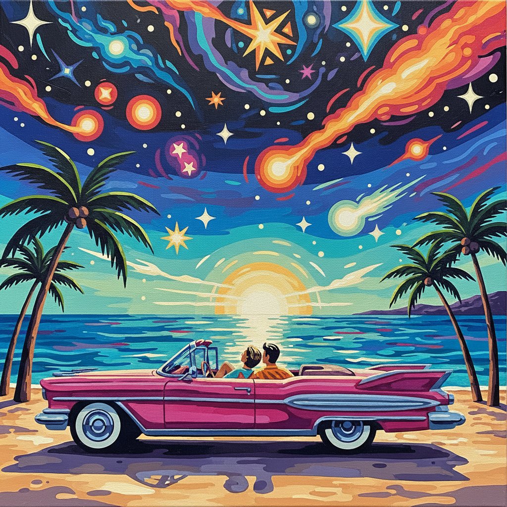 Embark on this creative adventure and discover the joy of painting. This unique kit brings together tropical vibes, vintage automobiles, and starlit skies in one magnificent artwork.