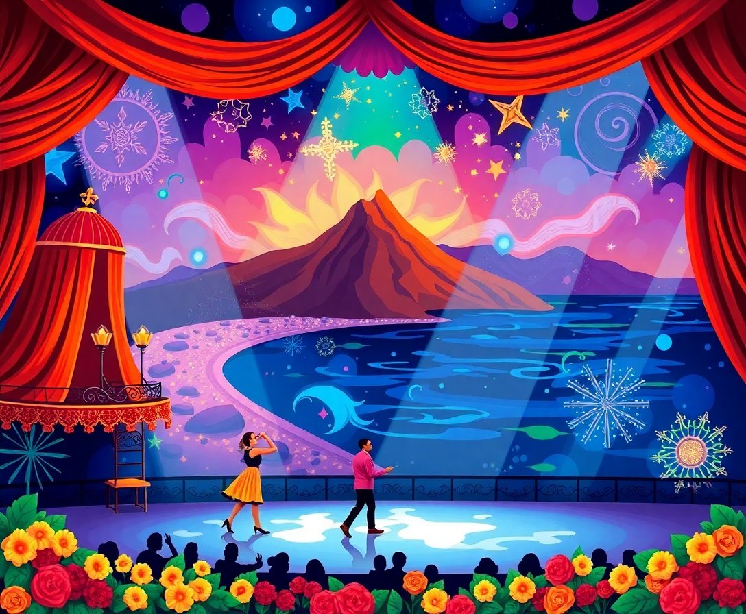 This vintage cabaret theme makes an excellent gift for art lovers, especially those who appreciate New Year’s celebrations and tropical carnival imagery.