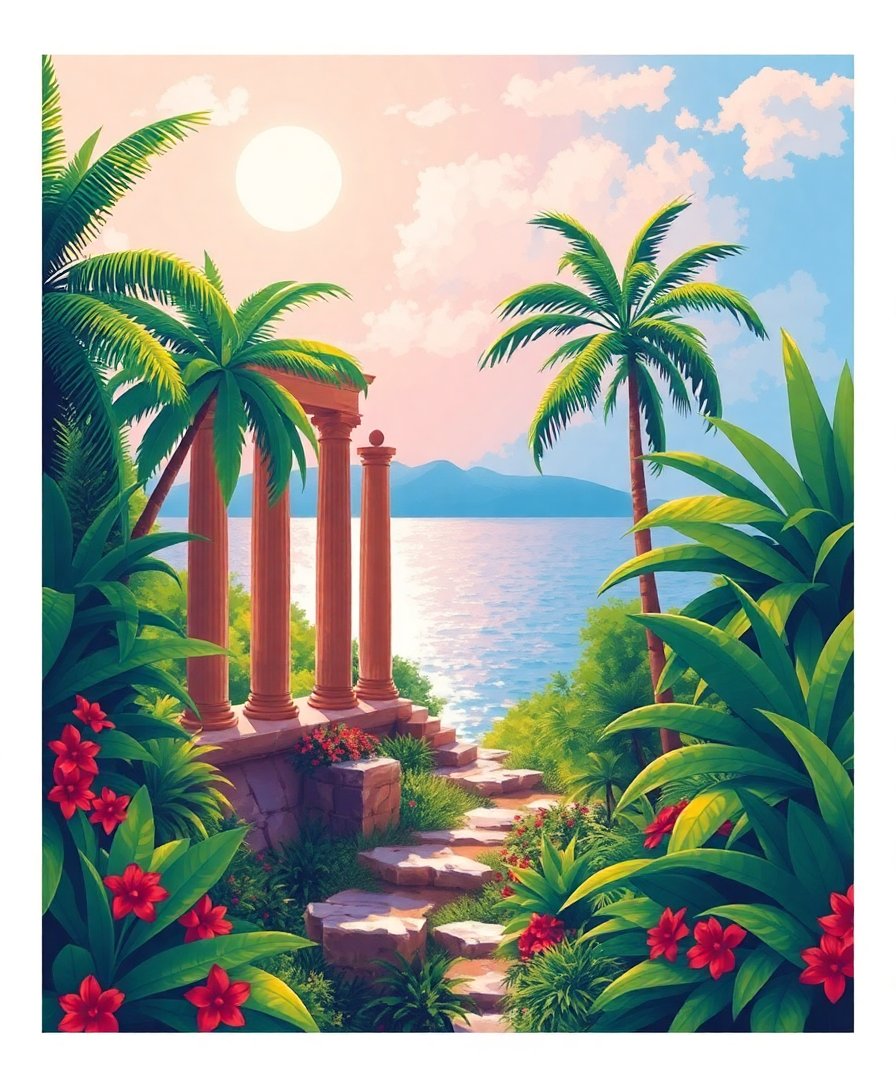 Transport yourself to an ancient paradise where weathered stone pillars stand majestically among lush tropical vegetation. This Ruins Amidst Tropical Foliage Paint By Numbers kit captures the nostalgic beauty of forgotten civilizations kissed by warm Mediterranean sunshine.
