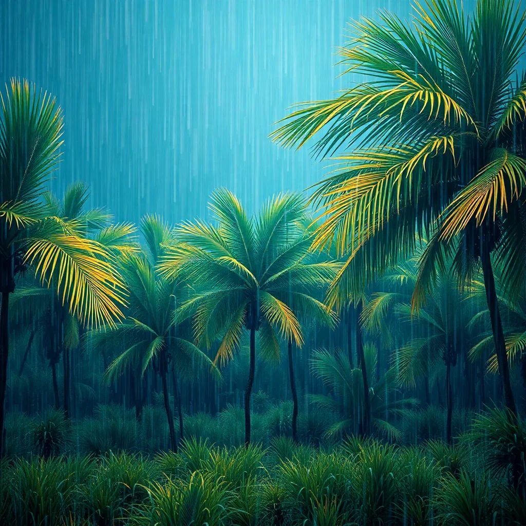 Ultimately, step back and admire your completed masterpiece. The tropical palms and gentle rain create a tranquil scene. Your finished artwork becomes a stunning conversation piece.