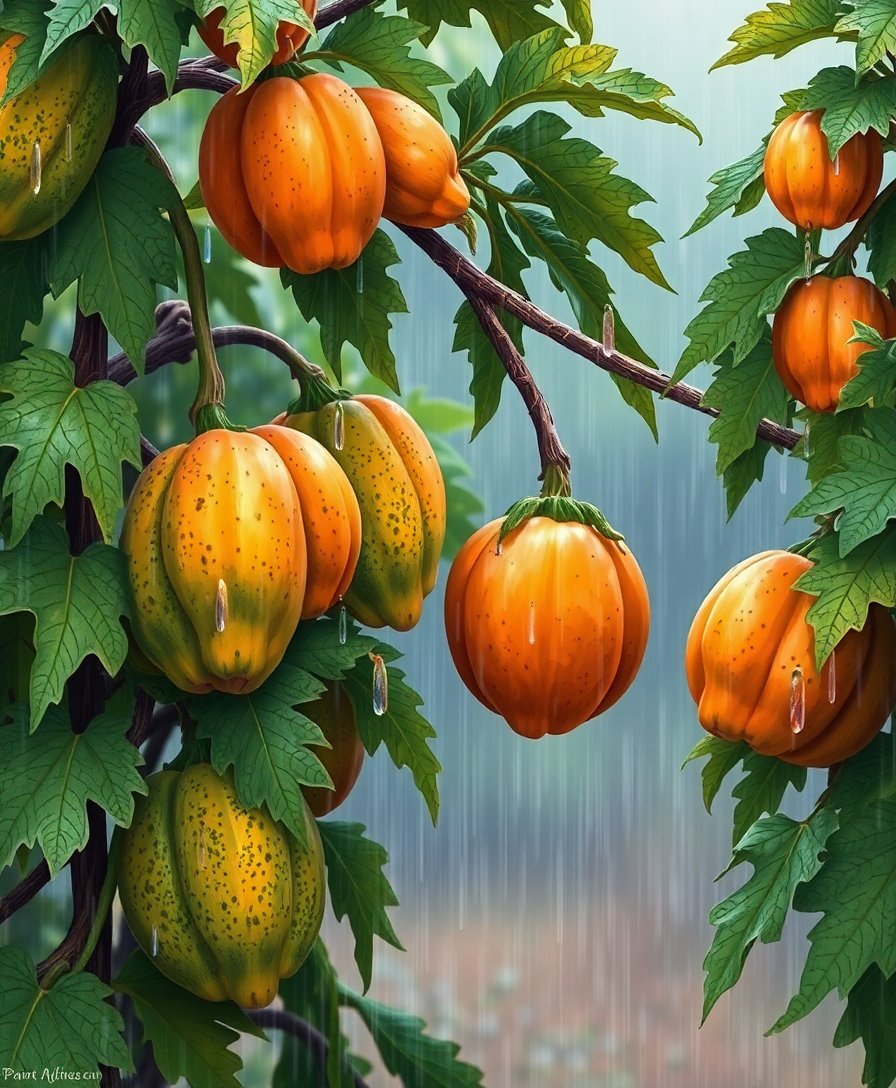 This realistic papaya tree scene captures the essence of harvest season with dramatic water drops and moody sky elements. The detailed design offers both challenge and satisfaction for nature art enthusiasts.